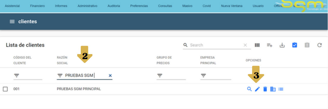 2. En la opción de búsqueda indicar el nombre del cliente que debe aparecer en el registro.