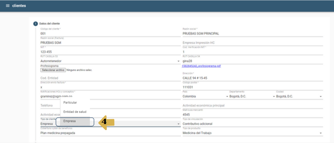 4. La lista desplegable del campo tipo de cliente debe tener la elección empresa o particular.