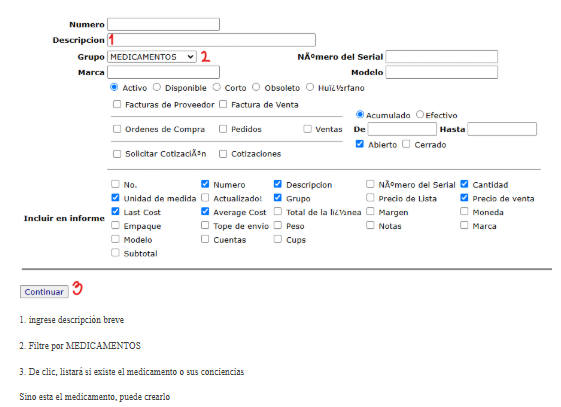 Confirmar que el medicamento aparezca en el listado y esté disponible para su uso en fórmulas o atenciones.