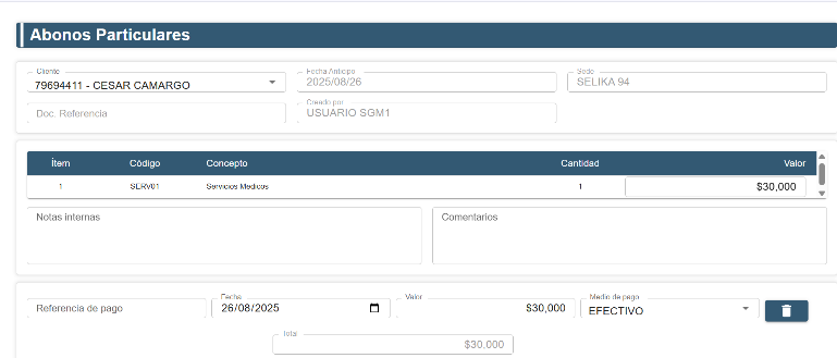 La funcionalidad de Abonos de Particulares permite registrar pagos anticipados realizados por pacientes particulares.