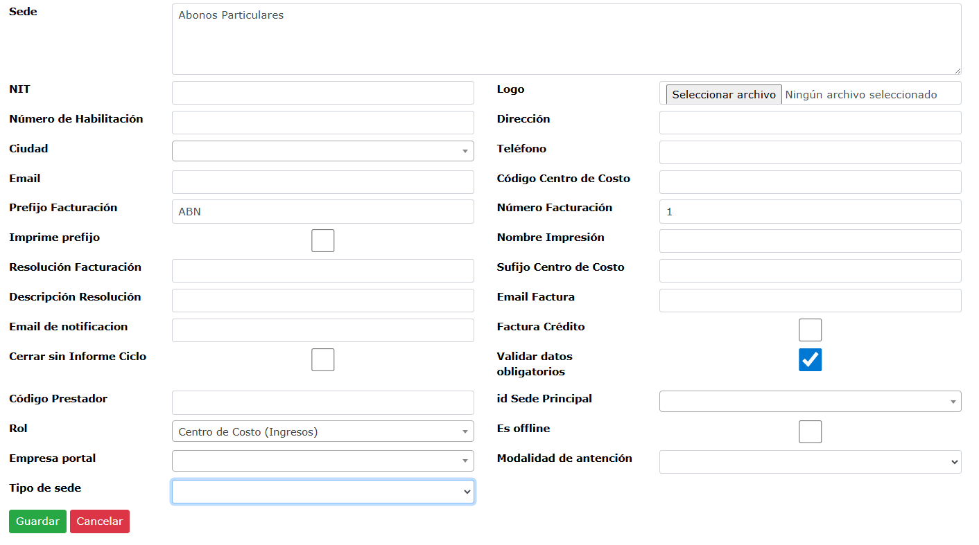 • Configurado como “NO sucursal”. El campo Tipo de sede debe estar sin informar.