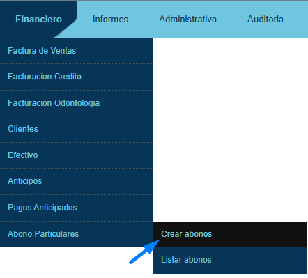 • Ingrese al menú: FINANCIERO / ABONOS PARTICULARES / CREAR ABONOS.