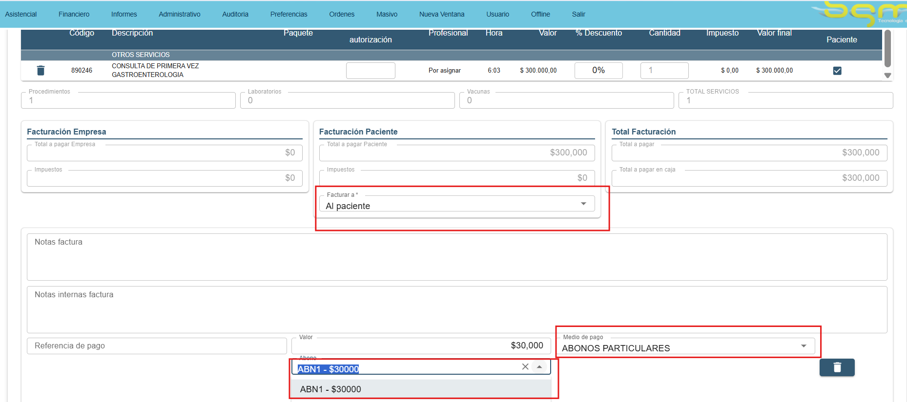 Para utilizar los abonos registrados como medio de pago en los servicios médicos de un paciente particular, siga estos pasos: