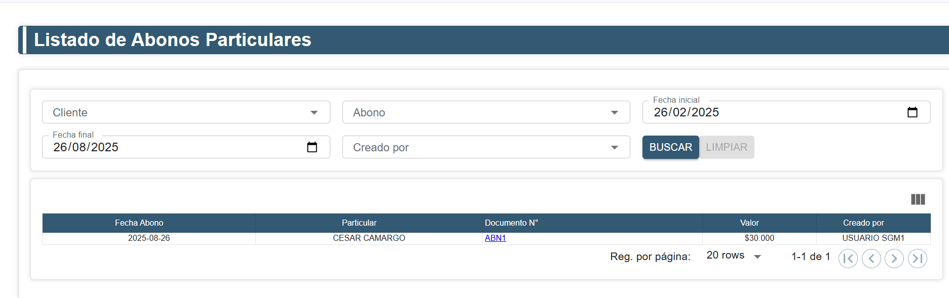 El sistema mostrará el listado de abonos que cumplen con los filtros seleccionados.