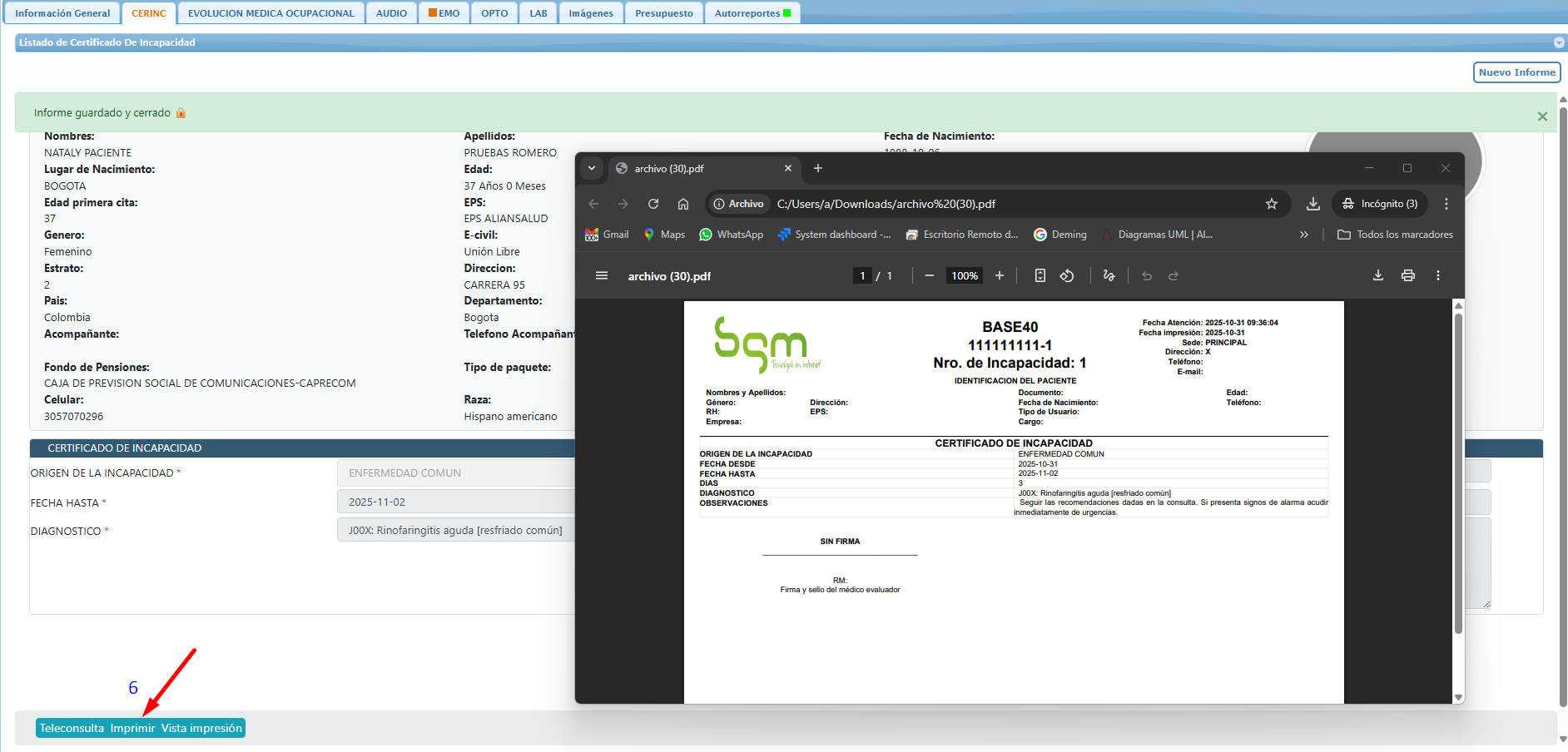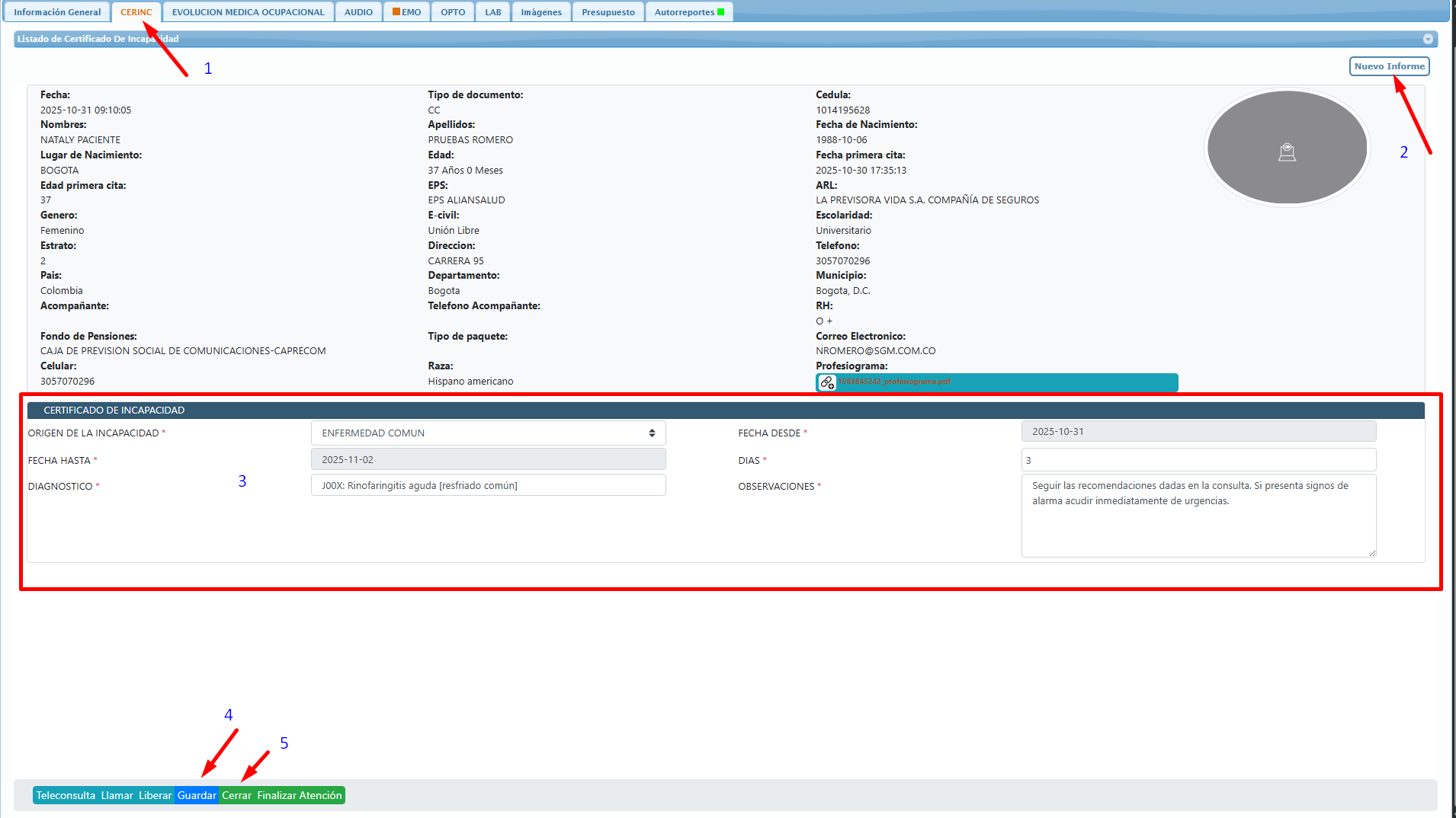 Durante la atención del paciente y una vez se guarde la historia clínica que este en consulta,realice lso siguientes pasos: