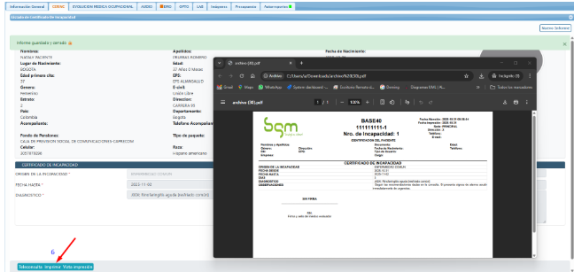 Este proceso permite generar certificados de incapacidad médica para un paciente dentro del sistema SGM, los cuales justifican la ausencia laboral por motivos de salud.