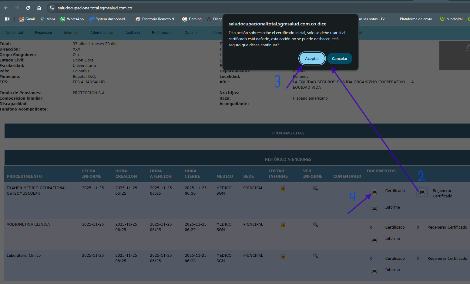 Desde la versión 4.4, se ha implementado una nueva funcionalidad que permite regenerar el certificado en caso de que este se haya generado con errores, o generarlo nuevamente cuando se han realizado cambios en los datos sociodemográficos del paciente. Para realizar este proceso, siga los siguientes pasos: