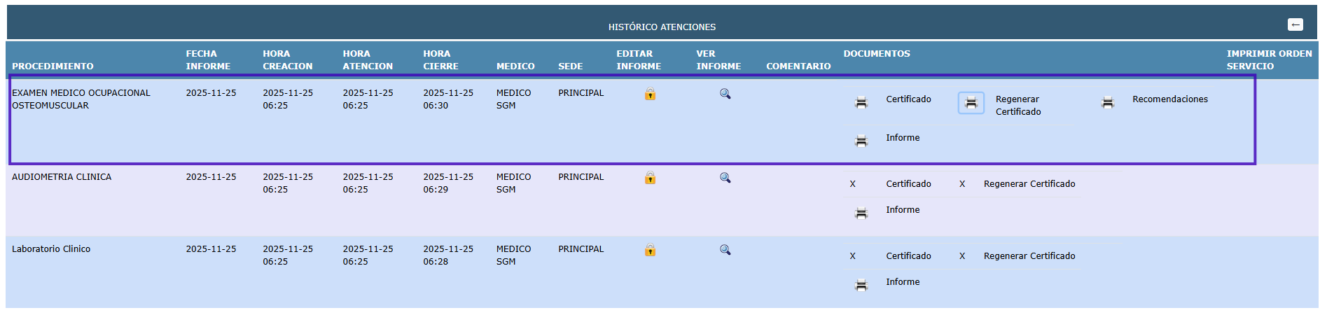 - Desde la ficha del paciente, en la sección HISTÓRICO ATENCIONES, ubique el registro que contiene el certificado a regenerar.